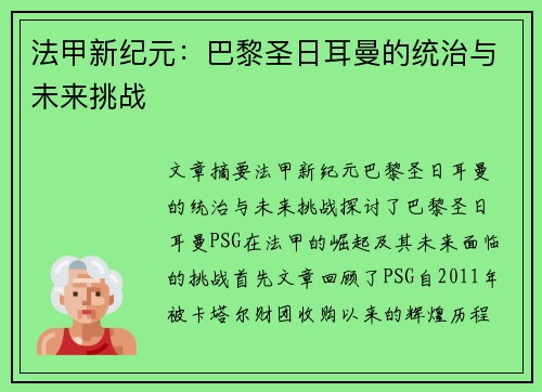 文章摘要:《法甲新纪元:巴黎圣日耳曼的统治与未来挑战》探讨了巴黎圣日耳曼(PSG)在法甲的崛起及其未来面临的挑战。首先,文章回顾了PSG自2011年被卡塔尔财团收购以来的辉煌历程,分析了其如何凭借巨额...